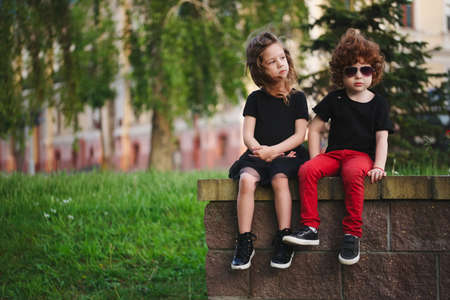 Portrait of a cute little girl and boy in the park at sunset