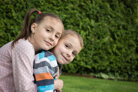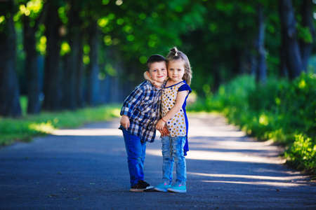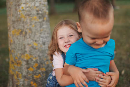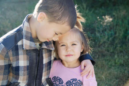 Boy and little girl hugging portrait. Happy smiling children outdoors at sunny day.Friendship siblings. Brother embrace little sister