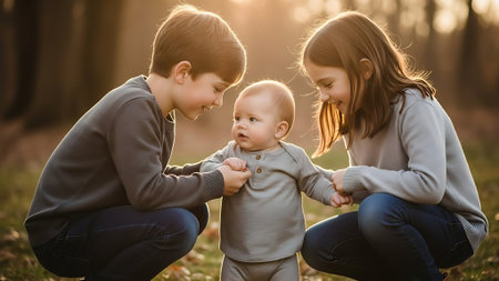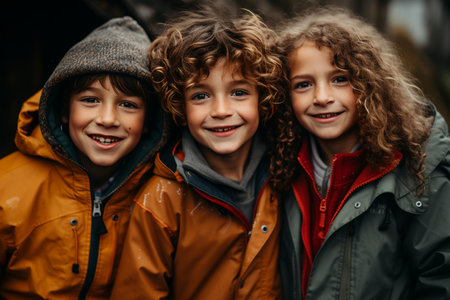 Playful Childhood Joy: Two Cute Caucasian Girls and a Boy in a Park, Expressing Happiness and Enjoyment Outdoors