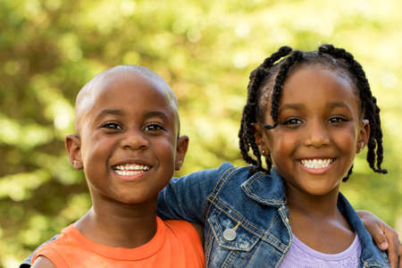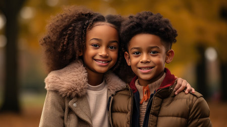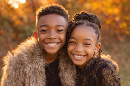 Portrait of joyful African American siblings smiling together in a warm autumn setting during golden hour