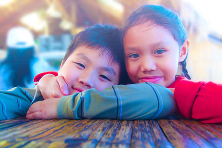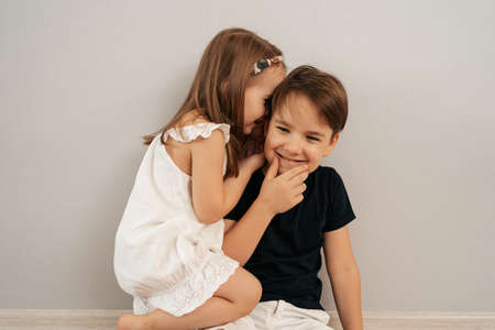 Boy and girl brother and sister sit and cuddle