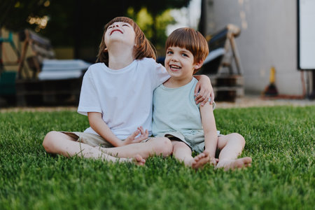 Two children are captured in a moment of pure joy, laughing heartily in an outdoor setting. The image showcases warm sunlight and a blurred background, creating a cheerful atmosphere. The composition and lighting are suitable for a variety of uses, including marketing, editorial content, and educational materials.