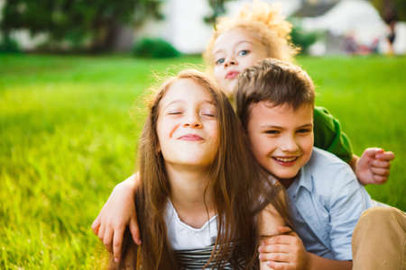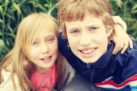 Portrait of charming smiling younger brother and older sister, sitting together in the park, hugging. happy lifestyle kids. Friendly relations between offspring