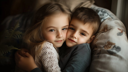 Two young children embracing warmly on a cozy couch surrounded by soft blankets and natural light streaming in