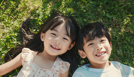 happy asian little girl and boy lying on green grass in park
