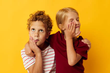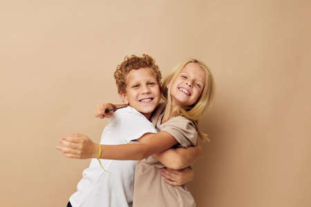 Portrait of cute children hug entertainment posing friendship beige background