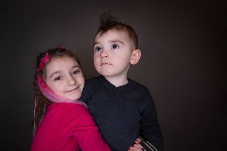 Boy and girl hugs together and smile. Brother and sister in studio