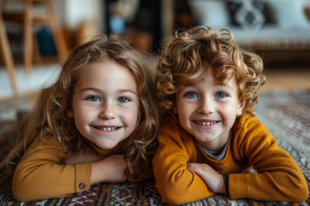 portrait of siblings looking at camera and laughing lying on the floor at home