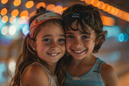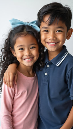 A joyful girl with curly hair and a blue bow stands next to a boy in a navy polo, both radiating happiness. Their warm expressions and close bond capture the essence of childhood friendship and innocence.