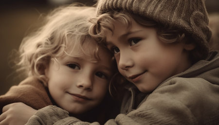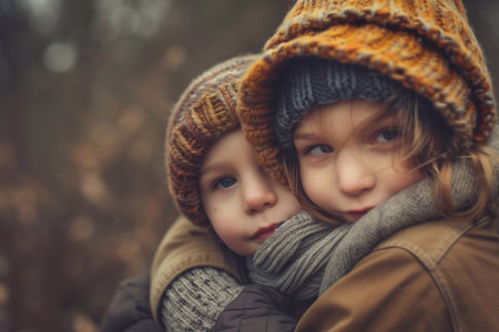 Two young kids share a heartfelt hug outside, dressed warmly in knitted hats and scarves, enjoying a chilly day together
