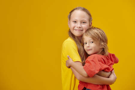 Studio shot of cute girl and her little brother in colourful summer clothes hugging each other and smiling. Yellow background. Happy family. Copy space.