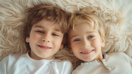 Two young boys smiling and lying close on furry blanket