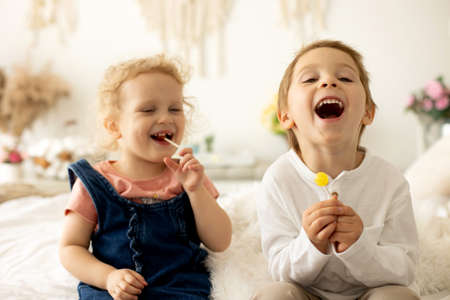 Cute toddler children, boy and girl, eating lolly pops at home, enjoying sweets