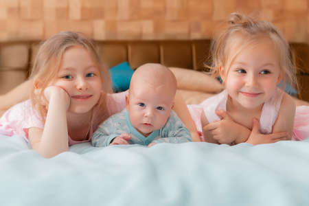 Portrait of a cute 3-month-old baby and two happy little sisters girls hug on a a bad. Newborn child relaxing in bedroom. Family morning time at home