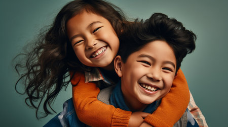 An AI generated illustration of a studio portrait of two smiling children hugging on a green background