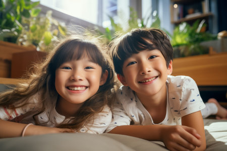 happy Asian brother and sister having fun together at home.