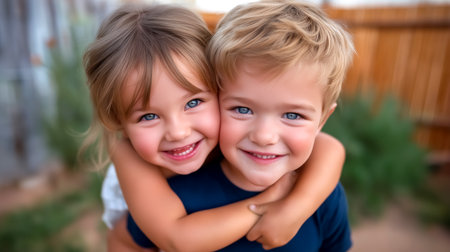 Children share a playful hug while smiling brightly outdoors. Background features a wooden fence with greenery. Concept of family bonding, childhood joy, friendship.