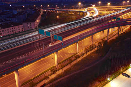 Road intersection with bridges and highways, car traffic and trucks in blurred speed motion, aerial top view at night.