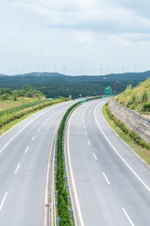 Paved road curve on mountains.Road dividing line.The road to the mountain.The asphalt road on both sides of the road is covered with grass.