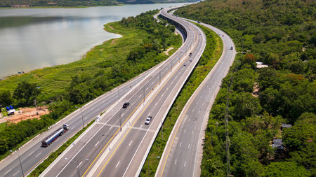 Drone shot The M6 motorway Nakhon Ratchasima Province - Bang Pa-in Lam Ta Khong River and Mountain Drone shot of scenic landscape rural place traffic. Motorway Korat Thailand