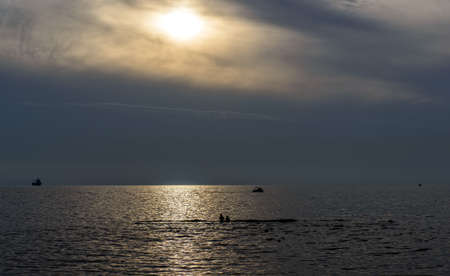 Boats at sunset sail on the sea