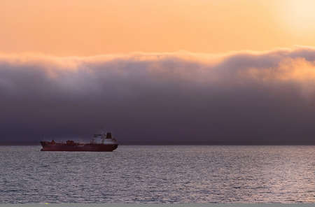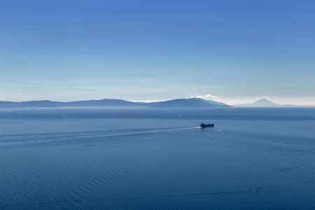 Cargo ship on the horizon in the sea against the background of the sky with clouds