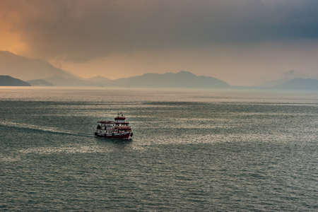 Ko Samui Island, Thailand - March 18, 2019: Sunrise over the hills paints orange to yellow canvas in the dense clouds. Brown traditional sea ferry on gray sea water with lighter patches by emerging light.