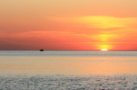 A large vessel on horizon in the atlantic ocean under the bright sun and red sunset. Sunlight reflection off the water