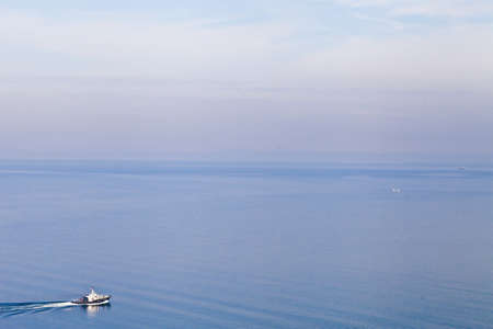 The boat goes to the sea in a clear weather during a full calm