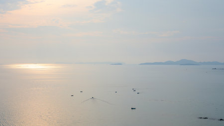 A beautiful scenery of ships sailing in the peaceful sea at sunset