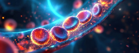 Red blood cells flowing through a vein with vibrant lighting effects