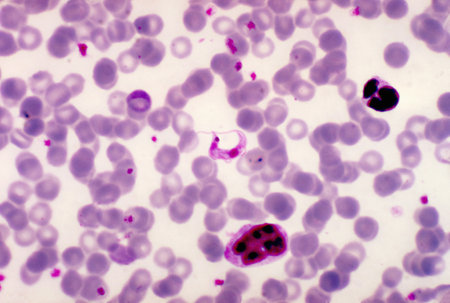 Malaria blood parasite infected red blood cells laboratory background.
