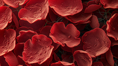 This image presents a close-up view of human red blood cells, showcasing their unique structure and role in oxygen transport within the bloodstream.