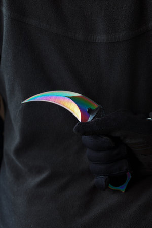 The man in black holds a curved kerambit knife behind his back. A criminal with a knife hidden behind his back