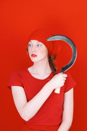 Girl with a sickle in her hand on red background