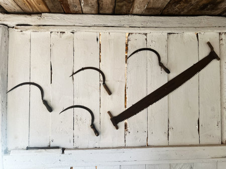 decoration with old hand harvesting tools hung on the wall