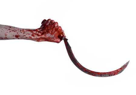 bloody hand holding a sickle, sickle bloody, bloody scythe, bloody theme, halloween theme, white background, isolated, killer, psycho, thug, a bloody knife, bloody hands of zombies, cutthroat