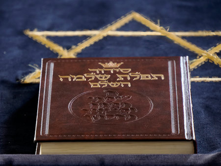 A Jewish prayer book, with blurred background with Jews praying at the Western Wall, Jerusalem