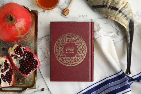 Flat lay composition with Rosh Hashanah holiday symbols on white marble table. Book Torah with text in Hebrew