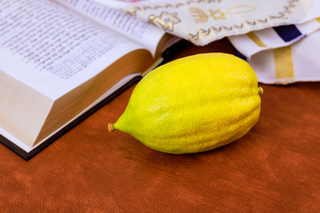Yellow etrog citron fruit on open Hebrew prayer book Torah text during Jewish holiday of Sukkot against traditional religious text. Tanakh prayer holy book