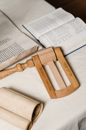 Grogger noisemaker for Purim. Rabbi with jewish hebrew bible is praying for Israel. Purim celebration. Rabbin is reading Tanakh jewish bible