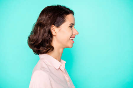 Profile side view portrait of nice cute pretty cheerful cheery curly-haired lady wearing formal shirt isolated over turquoise teal pastel background