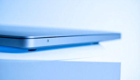 A close up side view of a closed silver laptop resting on a white surface with soft blue lighting casting a glow.