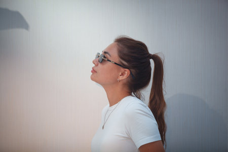 Young Woman with Short Dark Hair Wearing Stylish Sunglasses Looking Up at the Clear Blue Sky Feeling the Wind, and Sunlight on Her Face in a Moment of Freedom Peace and Serenity Outdoors on a Sunny Day