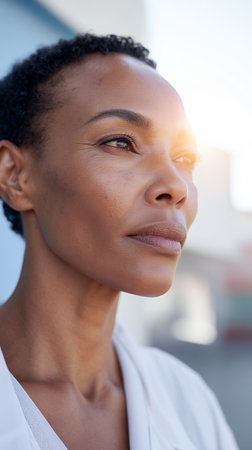 A woman stands outdoors in the sunlight, looking off into the distance. Her expression shows thoughtfulness. The background features a blurred urban setting.