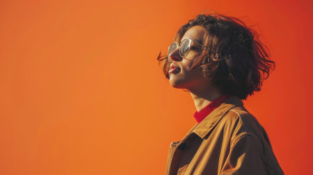 Intense gaze of a woman with curly hair and stylish eyewear, illuminated by warm sunlight