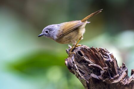 beautiful plain prina Prina inornata possing on log in forest of Thailand
