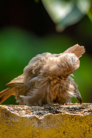 Ceylon Rufous Babbler (Turdoides rufescens) on a beautiful branch with beautiful colonies of mold on a background of green foliage. Sri Lanka endemic species, December