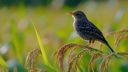 A bird perched on a rice stalk in a jasmine rice field in Isaan, Thailand, surrounded by winter greenery.