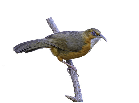 Rusty-cheeked Scimitar Babbler or Pomatorhinus erythrogenys, beautiful bird isolated perching on branch with white background and clipping path.